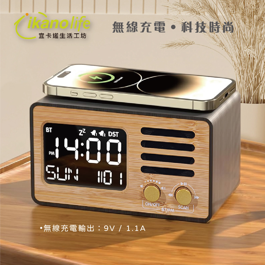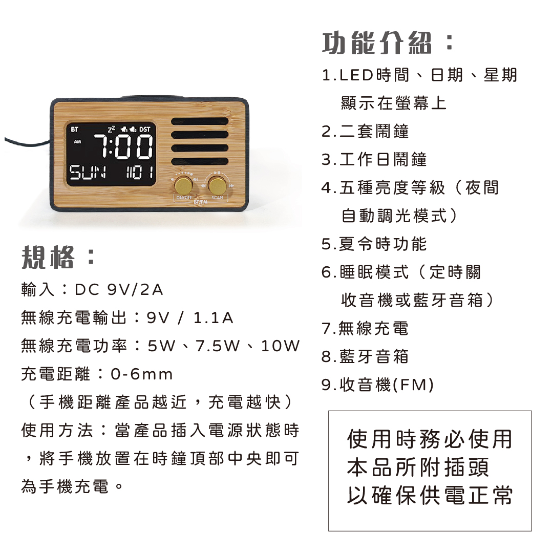 當產品插入電源狀態時,將手機放置在時鐘頂部中央即可為手機充電。